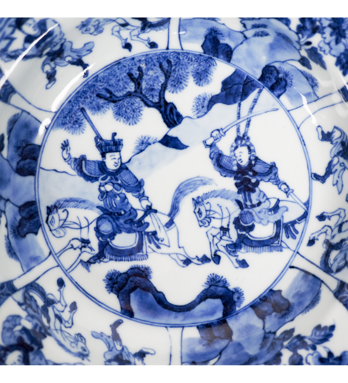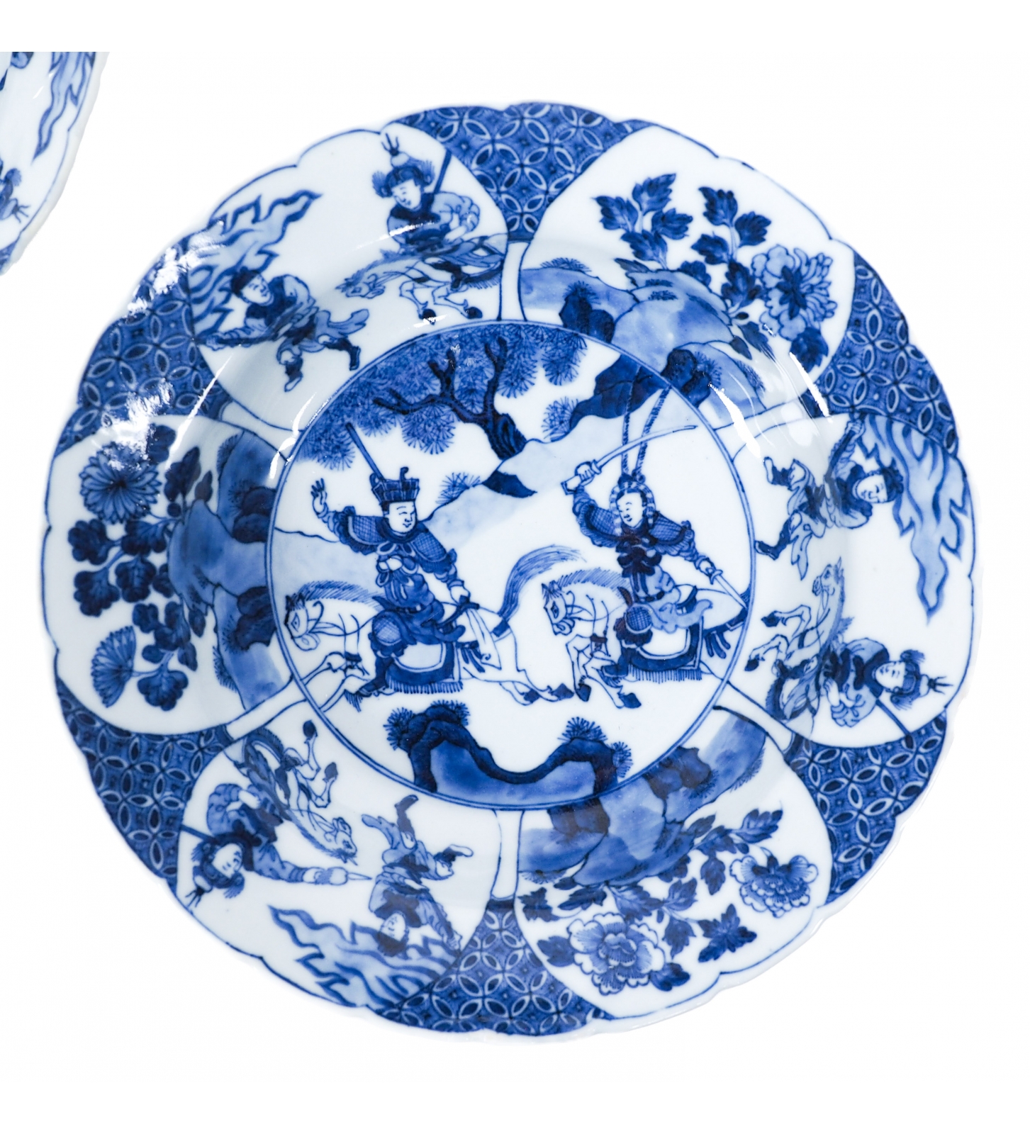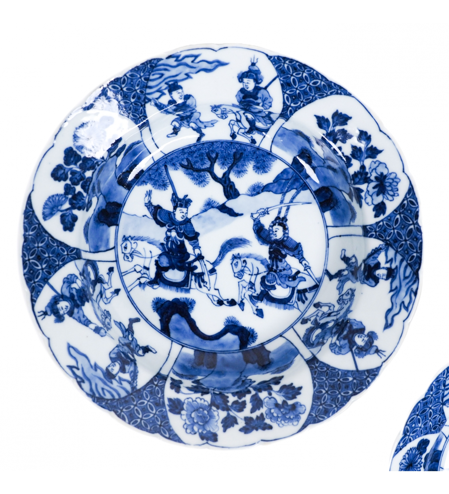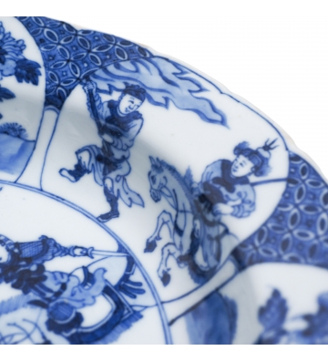 Each plate is finely painted in underglaze cobalt blue (qinghua), the central medallion depicting two figures from the Yang Jia Jiang (楊家將) “Generals of the Yang Family” cycle. We can see the celebrated warrior Mu Guiying, mounted on horseback, capturing her future husband, Yang Zongbao, beneath branches of flowering peony.
