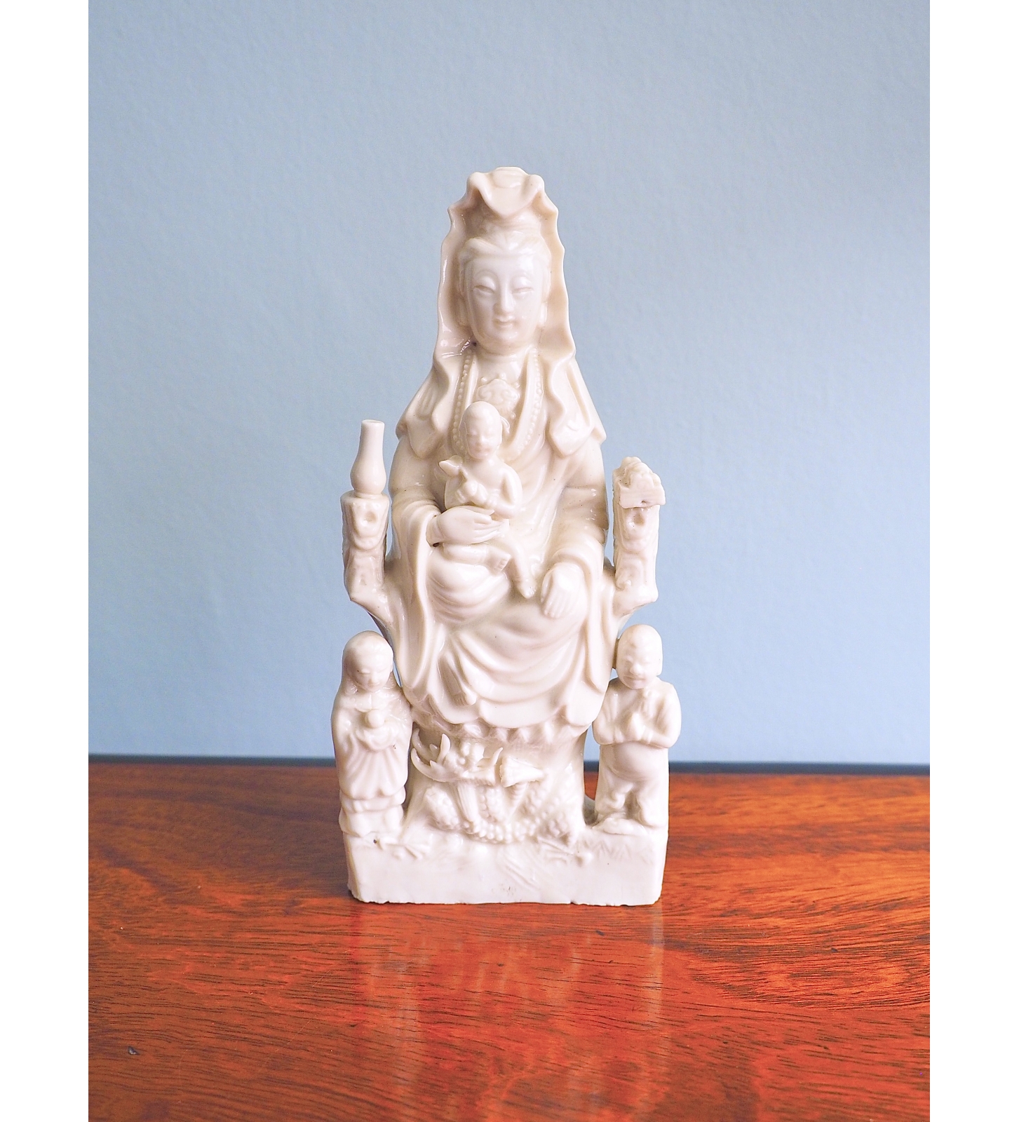 This Blanc de Chine porcelain figure from the late 17th century, made during the Kangxi period (1662-1722) at the Dehua kilns in Fujian Province, shows a Guanyin (觀音) holding a child, with two attendants at her sides and a dragon below. She is crafted with a mix of mold-made and light handwork. Guanyin figures are the most popular of all Blanc de Chine representations and are a common sight in Chinese art. Known as the goddess of mercy, Guanyin was highly revered in Dehua, though her roots are in Tibetan Buddhism as Avalokitesvara, the original patron deity. Her name, a shortened form of "Guan shi yin," means "one who hears the world's sounds," and she is known for her compassion, listening to people’s troubles and offering comfort. Guanyin is beloved by the Chinese as a merciful deity, especially among those hoping for children or preparing for journeys by sea.