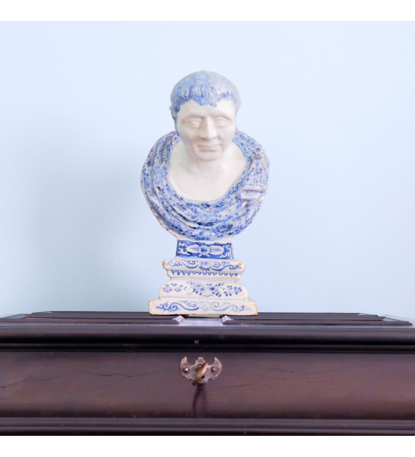 While the exact identity of the figure remains under study, it most likely represent Julius Caesar (100–44 BC). Also a found print of Marcus Tullius Cicero (106–43 BC) comes very close to the Delft bust. Both celebrated Roman statesmen frequently portrayed in classical sculpture. This bust stands as a vivid testament to Delft’s technical ingenuity and its fascination with classical antiquity. On stylistic and technical grounds, it is plausible — though not certain — that this type of bust was produced by leading Delft factories such as De Grieksche A (1657-1818) or De Metaale Pot (1670-1775), both active in the late 17th century.