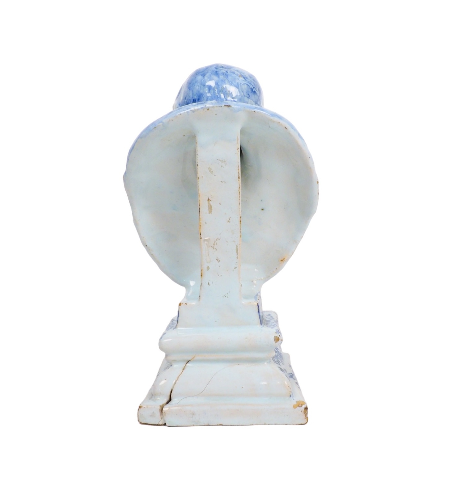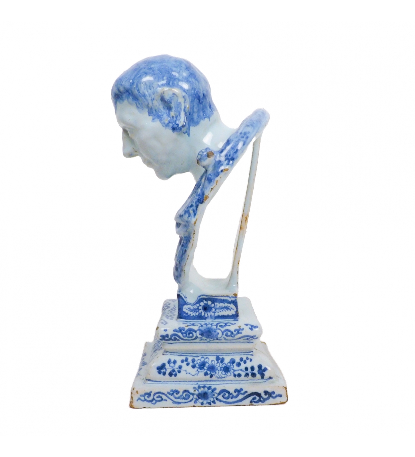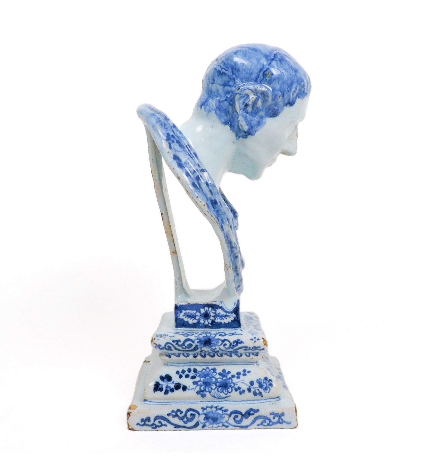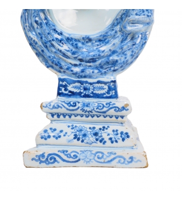 This rare blue-and-white Delftware tin-glazed earthenware bust dates to the late 17th century. Delftware of this period is renowned not only for its painted decoration but also for the start its ambitious figurative sculptural production. Busts such as this were made using sophisticated multi-part plaster molds, often taken from sculpted clay or wax models that themselves could be derived from classical sculpture or contemporary engravings. These molds were valuable workshop assets and were frequently reused, repaired, and subtly reworked, which explains why closely related busts can survive with small but telling differences in facial detail.