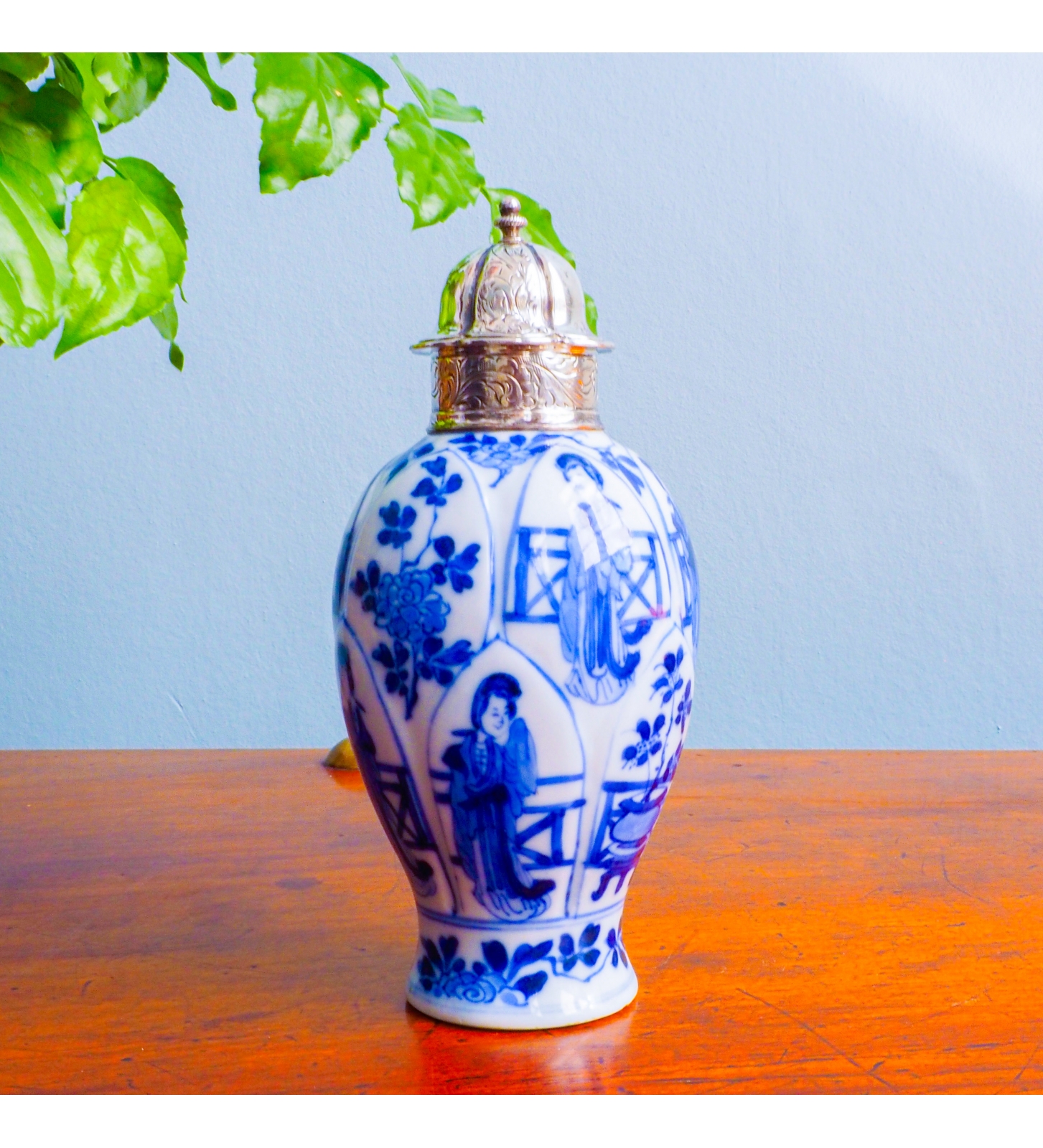 A very fine Kangxi period (1662-1722) porcelain tea caddy depicting Long Eliza's with a 19th century mounted lid, 18th century, around 1700-1720, China, Jingdezhen.